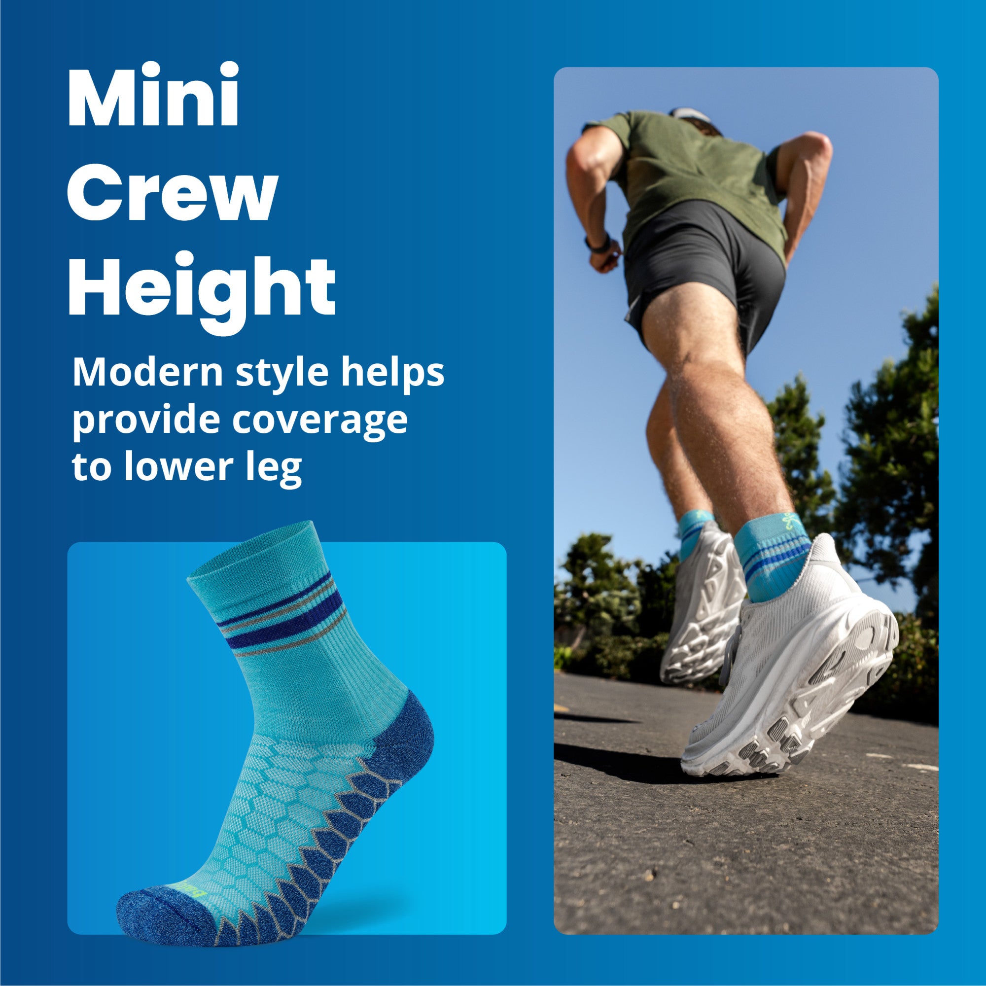- Secure and Precise Fit: Designed with a deep heel pocket and Mini Crew height to ensure the socks remain securely in place, preventing slippage inside the shoe and protecting the Achilles from blisters.